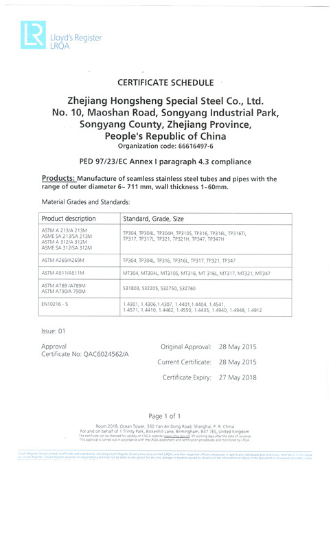 2015年5月10日至13日,LR(Lloyd'sRegisterofShipping)審核組一行來到浙江宏盛特鋼有限公司生產(chǎn)現(xiàn)場,對宏盛特鋼質(zhì)保體系、生產(chǎn)能力及產(chǎn)品檢測能力等一一進(jìn)行了現(xiàn)場審核。并對公司TP304材料、MT304材料、S32205材料不銹鋼管現(xiàn)場取樣,見證了化學(xué)成分、機(jī)械性能、超聲波探傷等型式實(shí)驗(yàn)。經(jīng)過多項(xiàng)審核,各項(xiàng)指標(biāo)均符合PED4.3相關(guān)要求。通過為期三天的審查,LR審核組對宏盛特鋼的質(zhì)保體系及生產(chǎn)能力給予了高度的肯定,同時(shí)公司也順利取得由勞氏頒發(fā)的PED97/23/EC4.3證書。